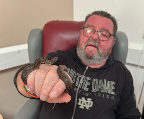 “It was fantastic for our patients to be able to meet such an array of British creatures, who reveal the wonders of our native wildlife,” said Rachel. “I’m so pleased that I conquered my fear and held a snake! Experiences like this are so beneficial for our patients, enabling them to engage with activities and conversations that aren’t connected to their illness, encounter and learn about new things, share their own knowledge, and interact with others.”